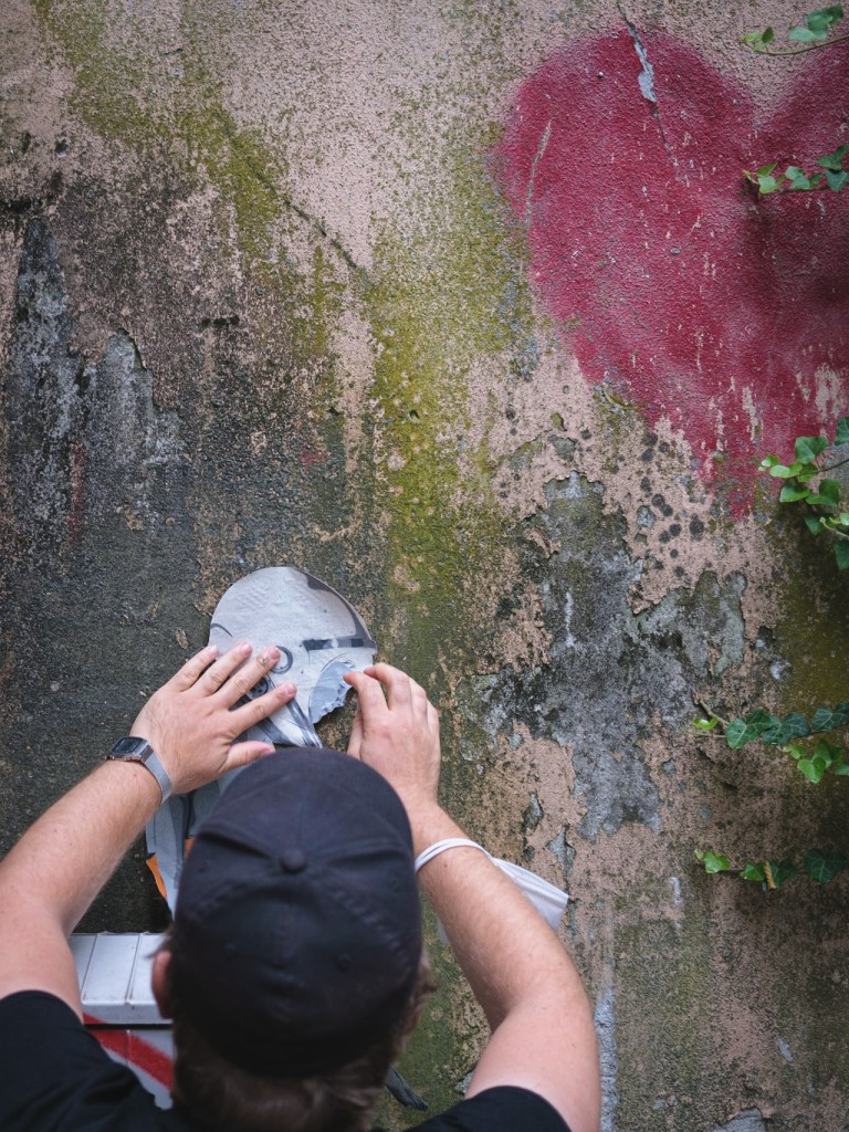 Kunstaffin bin ich schon immer, ich habe mit 16 angefangen, Grafitti zu machen. Leider haben die Ergebnisse nicht immer meiner Vorstellung entsprochen. In meiner Ausbildung als gestaltungstechnischer Assistent war ich dann gar nicht kreativ, aber die Idee von Grafitti fand ich immer noch interessant: Diesen städtischen Unorten etwas entgegenzusetzen, die Rückeroberung des öffentlichen Raums. Also habe ich für meine Street Art angefangen, das zu verbinden mit dem, was ich in der Werbeindustrie gelernt habe. Tatsächlich bedient sich die Werbung ähnlicher Techniken wie Street Art – Bilder in verständliche, einfache Motive zu verpacken. Auch im öffentlichen Raum ist es wichtig, dass man schnell begreift, worum es geht. Jedes meiner Bilder hat einen politischen Impuls, will dem Grau etwas entgegensetzen und bestenfalls Leute zum Nachdenken bringen oder ihnen ein Lächeln ins Gesicht zaubern.